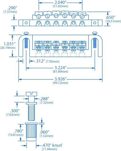 Two alignment screws adjust the overall intonation. The height-adjustable mounting studs include knurled bushings. The strings load from the front of the die-cast base, wrap over the back of the bridge, and over the notched saddles. Drill 7/16″ (11mm) holes for the bushings.
