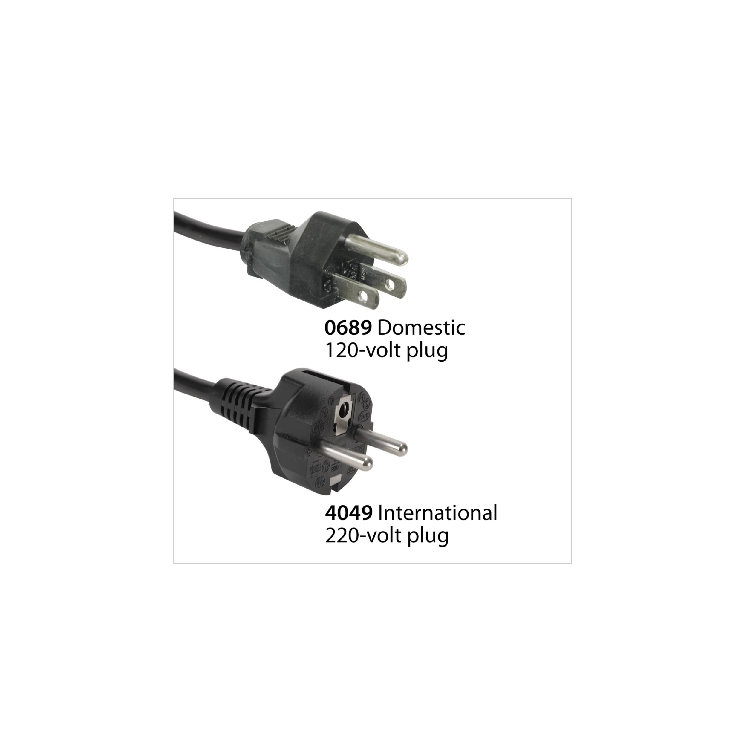 #4049 International model is a 220-volt (200 watt) AC electrical appliance has international plug CEE 7/7 (compatible with Type E and F receptacles) with two round prongs and two grounding clips on the sides and female contact to accept the grounding pin.
