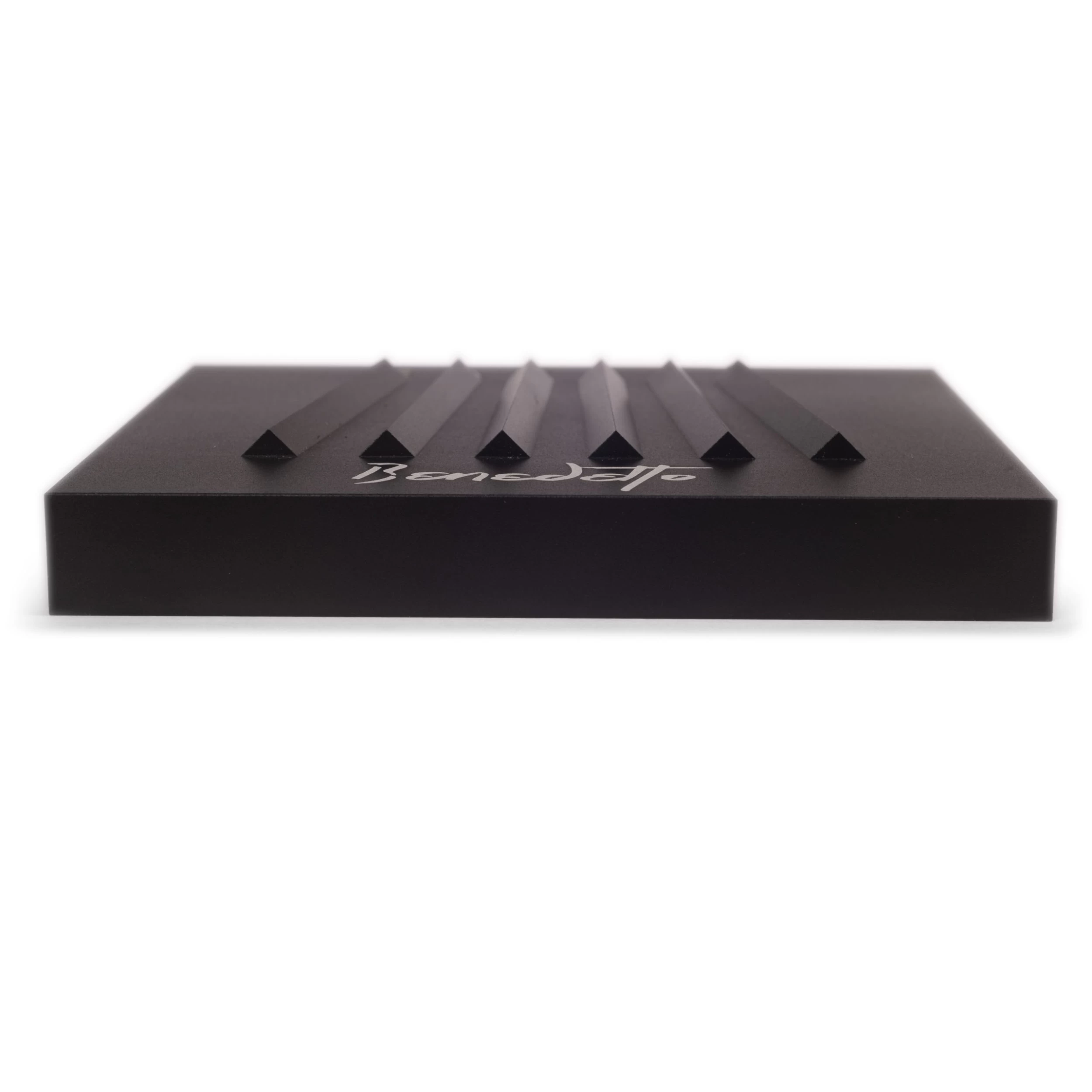 Designed by the legendary archtop luthier Bob Benedetto, this anodised aluminum tool works for nearly any wooden archtop bridge. No need to worry about different scale lengths or neck widths, the fan-shaped design is intuitive and simple to use.