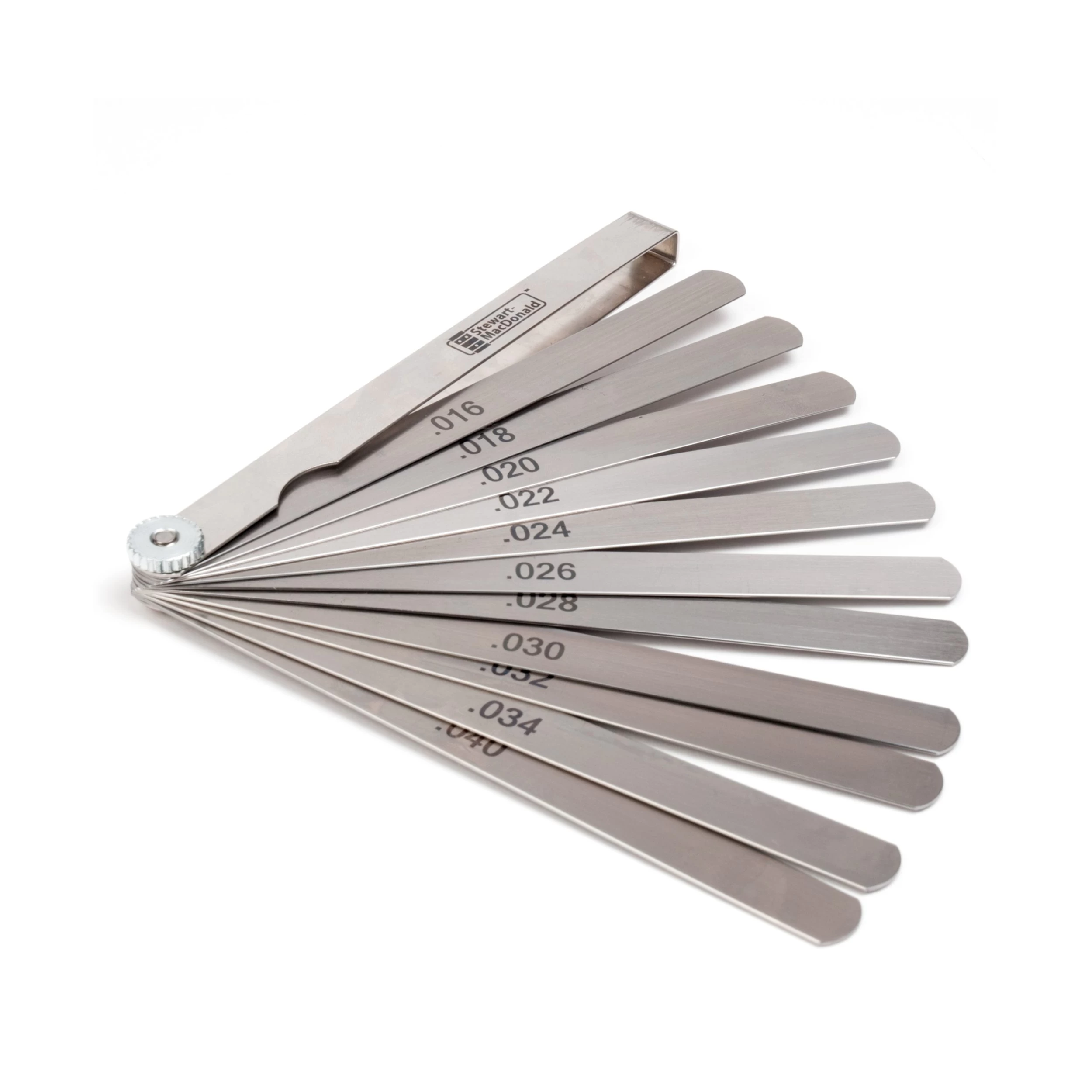 A set of 11 steel gauges that allow precision filing of nut slot depths.