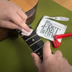 Fret Butter from DMI Guitar Labs lets you get rid of that gunk and polishes your frets at the same time. The all-in-one cloth is pre-treated with a food-grade cleaner. Simply use the Fret Butter cleaning cloth to apply the cleaner, then use a dry terry cloth rag to scrub and buff the fingerboards and frets. That’s it!