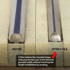 Z-Files won’t mess up your carefully-leveled fret tops because they only touch the sides of the frets. After you’ve leveled the frets for uniform height, your crowning file restores their rounded shape, leaving the thinnest possible line of leveled surface on top. This is when other crowning files can accidentally scrape the fret top, creating a buzzing low spot and ruining the job!