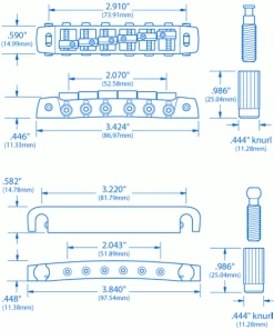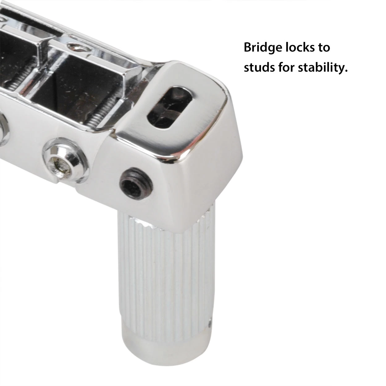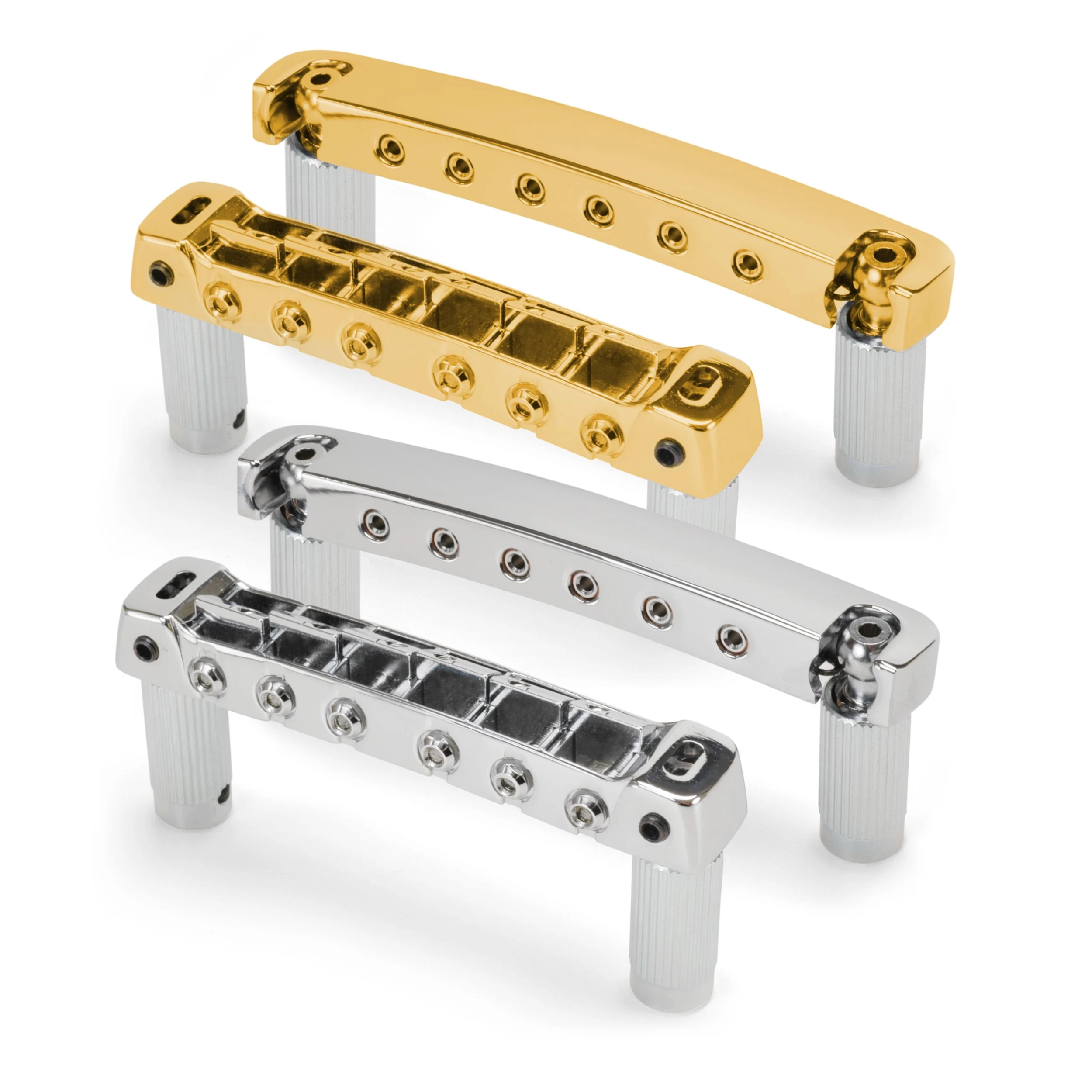 The Gotoh 510 Tune-o-matic Bridge is designed for absolute stability. Allen screws lock the individually adjustable saddles, height adjustment studs (this bridge uses no thumbscrews) and the overall bridge intonation angle. The result is better sustain, rock-solid intonation and improved string energy transfer. The saddles have helpful starter grooves to guide your notching files. Made of zinc.