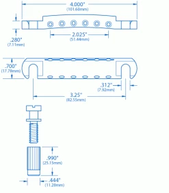 The mounting studs are spaced 3-1/4″ (82.55mm) center-to-center. Position the studs 1-1/2″ (38.10mm) behind the center of the bass side bridge mounting post. Use an 11mm drill bit to install the bushings. The strings can be installed from the front or rear.