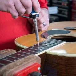 The revolutionary HeatStick softens glue without blushing delicate finishes or loosening the neck block or braces like steam can. It’s easy to control, and can be used for acoustic and electric guitars and mandolins. The HeatStick is 6″ of solid copper and includes two bits for drilling the pilot and access holes through the fretboard.