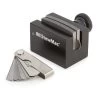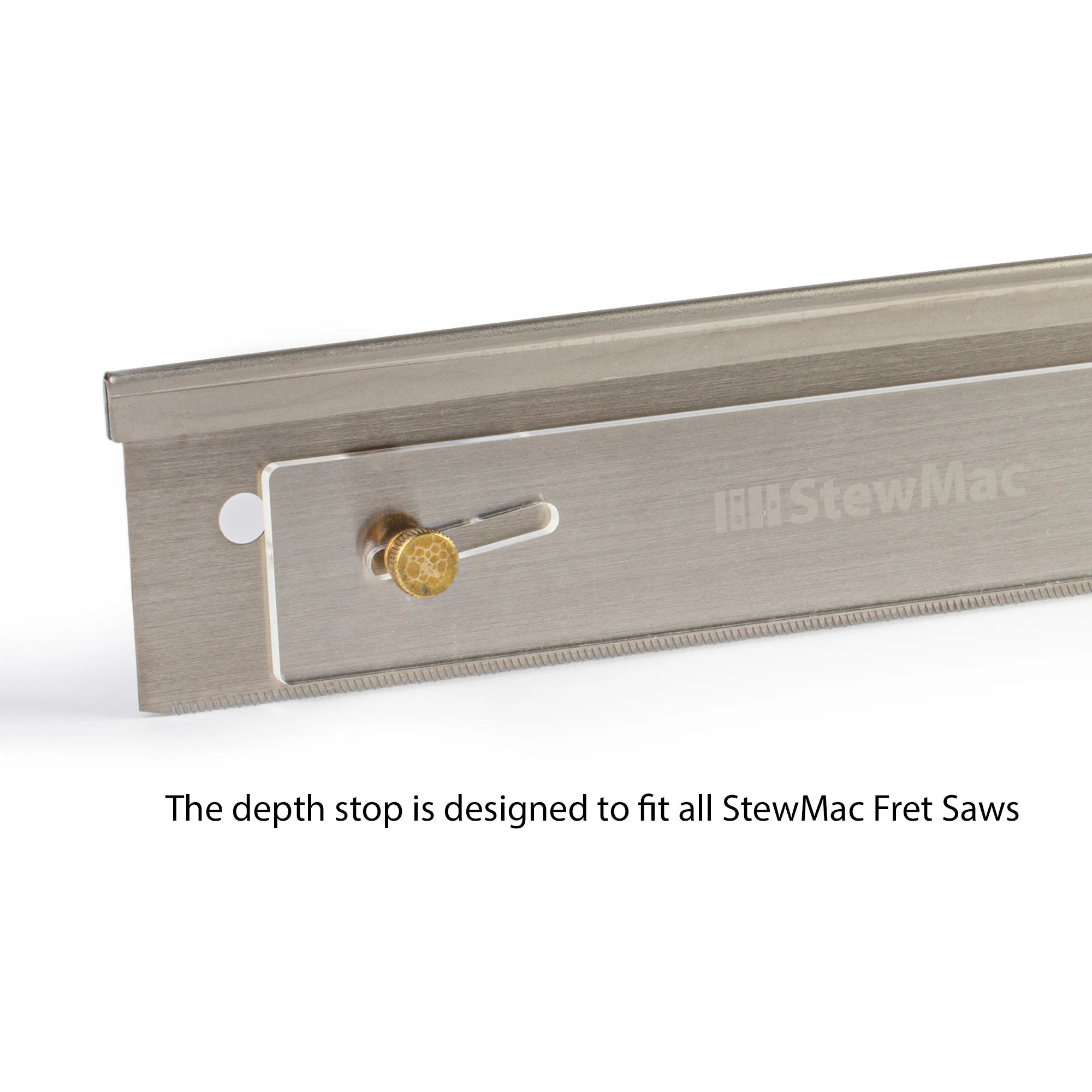 The thumbscrew-adjustable clear acrylic Depth Stop slides up and down for precise control of fret slot depth. It’s removable for cutting off the ends of a blank fingerboard, or for use with our Fret Slotting Miter Box.