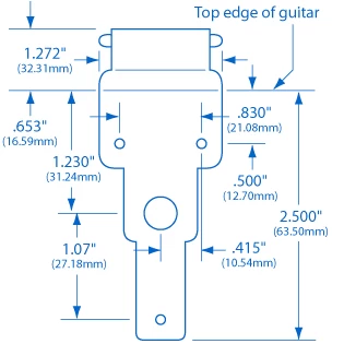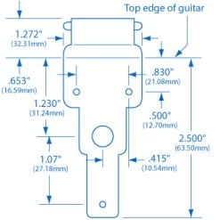 This tailpiece extends approximately 5″ (127mm) over the guitar top and 2-1/2″ (63.5mm) over the end of the instrument. The deco-shaped mounting plate has an 11/32″-diameter (8.73mm) endpin hole. The machined brass string mounting bar has 2-1/16″ (52.39mm) string spread. Screws included.