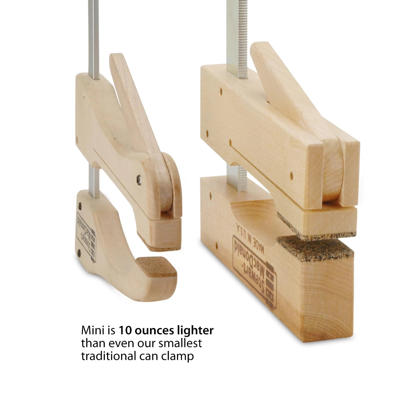 Made of sturdy hardwood and steel, the mini cam clamp has protective cork jaw linings, 5-3/8″ depth, 1/2″ width, and opens to 6-3/4″.