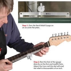 The Neck Relief Gauge accurately measures the amount of variation from a dead flat position, to take the guesswork out of adding or subtracting neck relief as you adjust the truss rod. Also sold separately