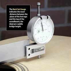 Determine bridge height: the Neck Set Gauge indicates the exact distance between the plane of the fret tops and the top of the soundboard, the ideal pre-saddle bridge height.