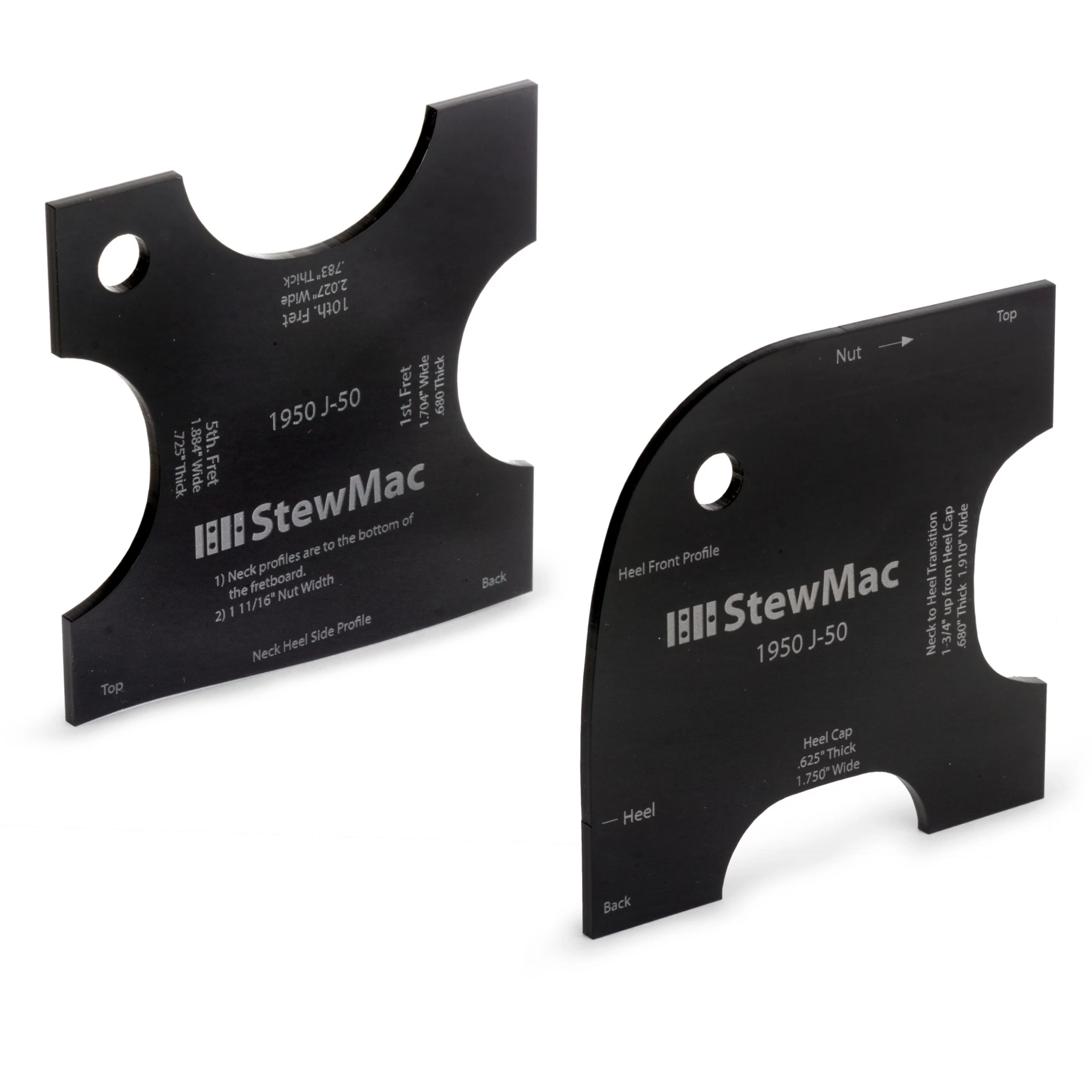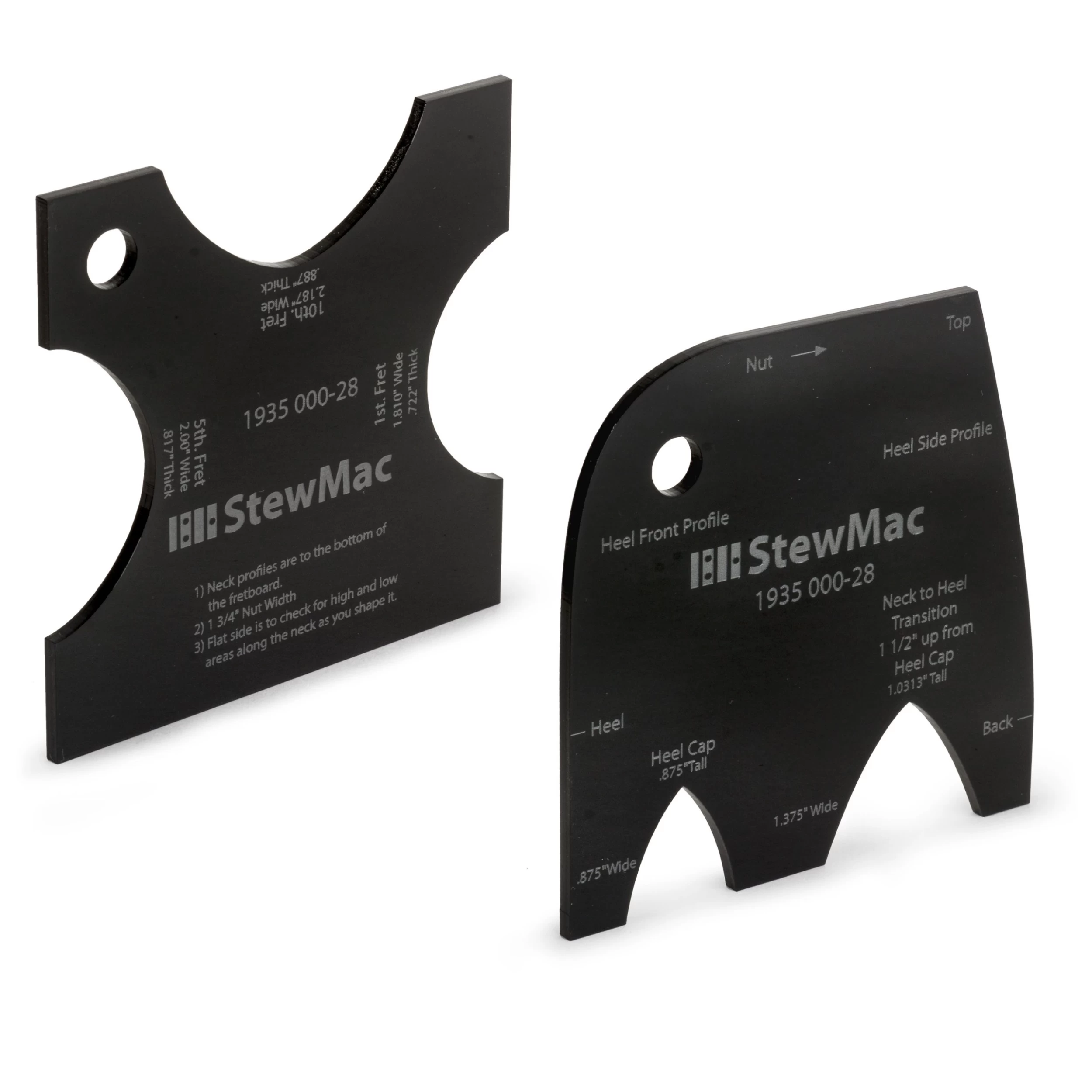 Everything you need to make perfect reproductions of sought after necks. These new templates have the exact contours of the neck shape from the 1st, 5th, and 10th frets, and several heel shapes. We also measured the thickness of the neck from the bottom of the fretboard, and etched the measurements on the tool.