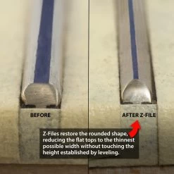 Z-Files won’t mess up your carefully-leveled fret tops—the abrasives only touch the sides of the frets. The shape keeps you on the fret and the diamond coating works faster and smoother than traditional toothed files.