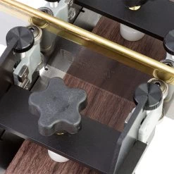The Fret Slotting Miter Box accommodates fingerboards up to 1/2″ (12.70mm) thick and 2-7/8″ (73mm) wide. The box is rugged aluminum, 12″ (305mm) long. The aluminum has a durable anodized black finish. Hex wrenches are included for setting the rollers to fit your saw blade.