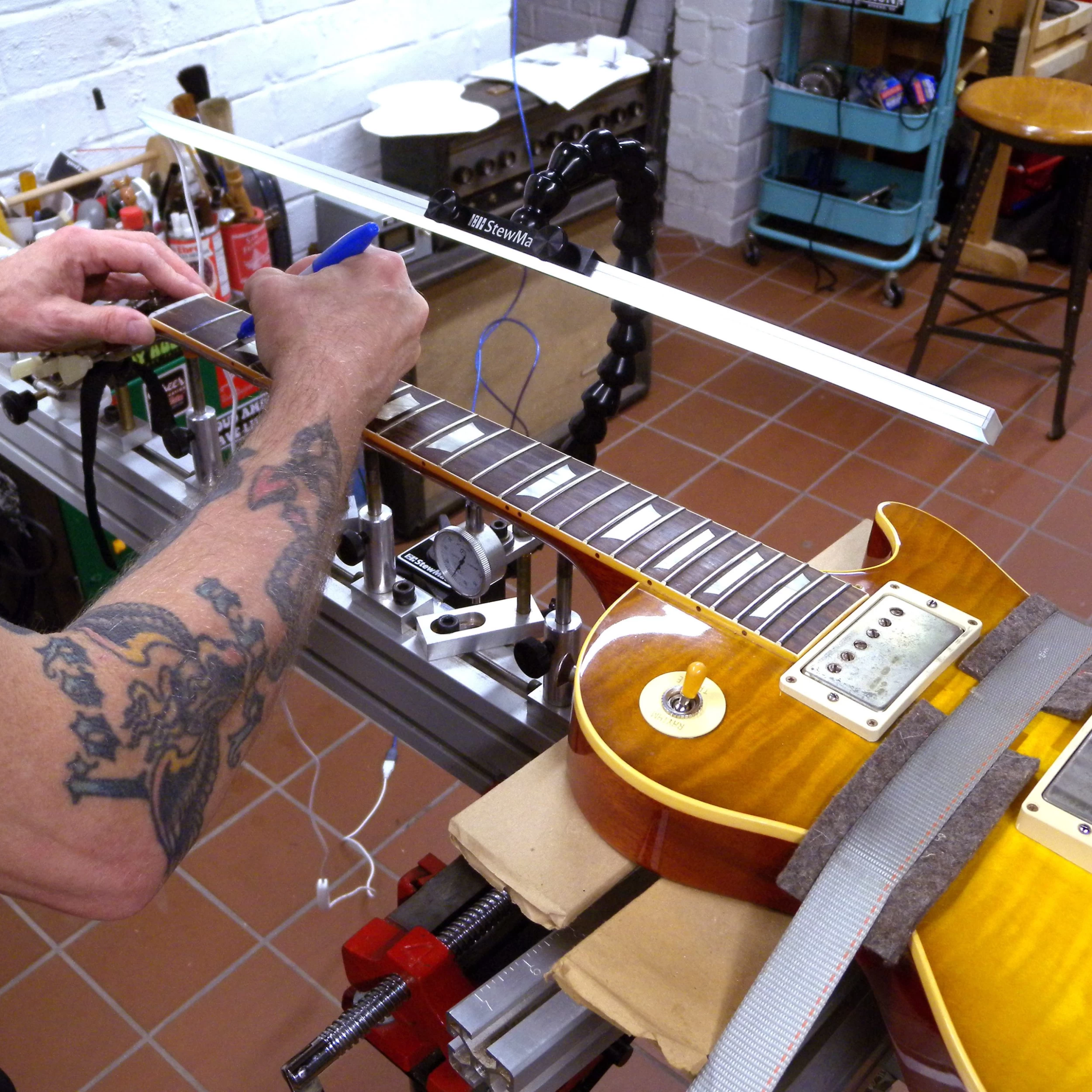 We finally solved the problem with the Light Jig! It easily attaches to the Neck Jig with magnets, no drilling necessary. The 19″ flexible arm holds our Full Fretboard Inspection Light—now you can see every curve, twist, and high or low spot across the entire neck. Pinpoint any problem areas right away—your fretwork will be more accurate than ever.