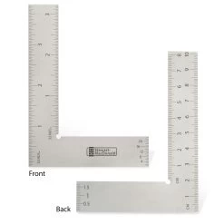 Square up parts, lay out string spreads, and accurately set up tools. 1/32″-increments on one side, millimeters on the other.