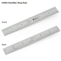Our Shop Rule is a 6-inch (152mm) precision steel rule designed specifically for instrument work. The satin chrome finish allows for easy marking with a pencil and the sharp black etching is easily viewed even in low light conditions. Each end of our Shop Rule includes small vertical rulers—perfect for measuring the saddle, nut, or pickup height. In addition, our Rule has a zero at the center, which eliminates guesswork when trying to find the center of the neck, bridge, or saddle. It’s a tool we reach for constantly.