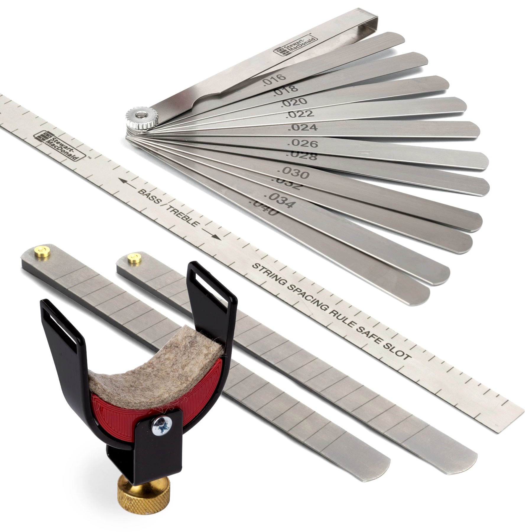 This set includes tapered wedges for both electric and acoustic guitars to mark out your trim line and a slim version of our String Spacing Rule to show where to put your string slots. Slide it into the Safe Slot, same as a feeler gauge, and see exactly where each string belongs. No measuring, dividing or calculating. Replace the rule with your feeler gauges and you’re ready to cut nut slots. Thanks to luthier Ron Baran for the idea of adding this slim spacing rule to the set.