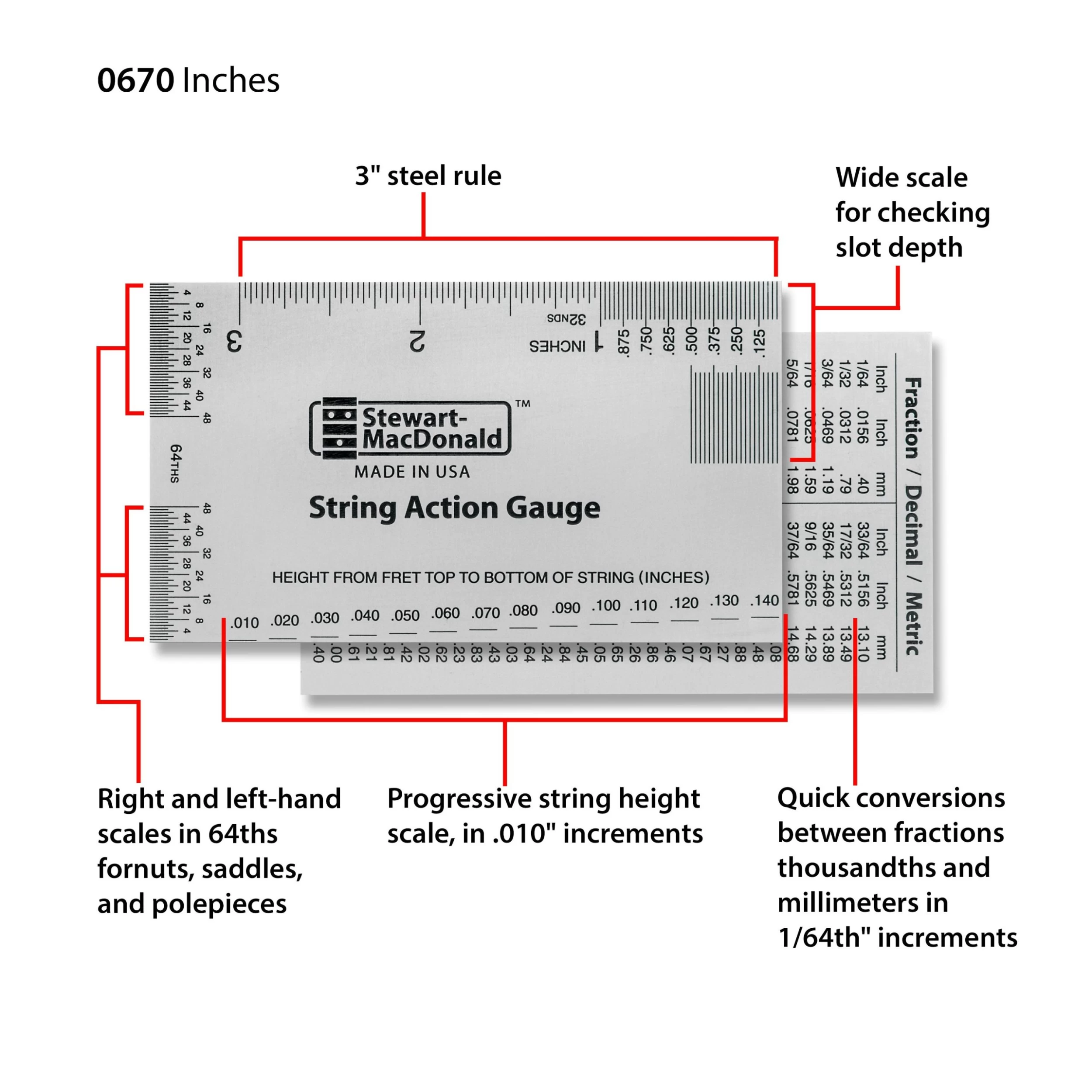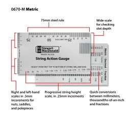 StewMac’s String Action Gauge has two models (sold separately) for measuring in inches or millimeters. The string height markers are graduated from .010″ to .140″ on the inch model, and from 0.25mm to 3.50mm on the metric version.