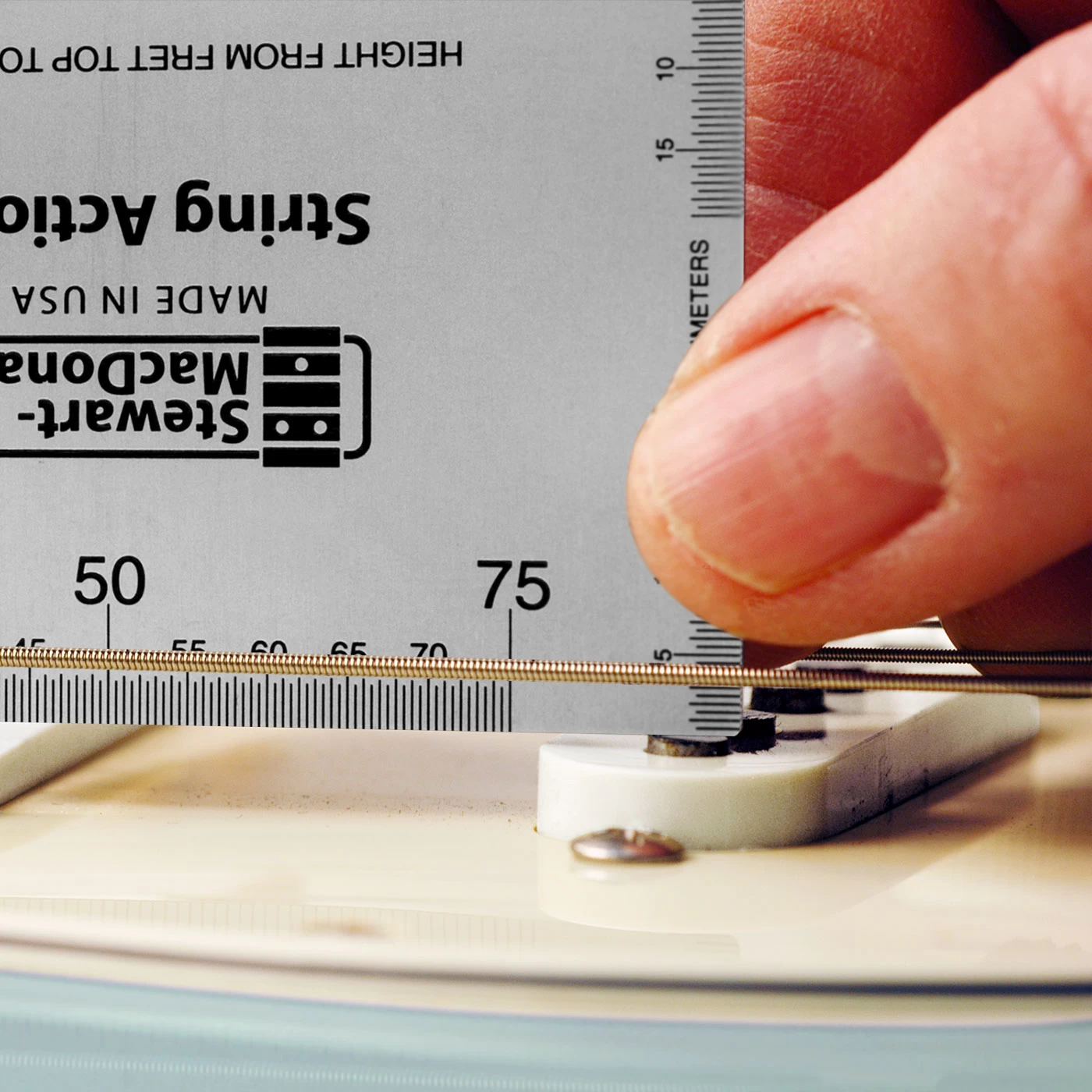 Developed here at Stewart-MacDonald by Dan Erlewine and Don MacRostie, the gauge features a progressive string height scale: simply slide it across the frets and read the measurement under the string. It’s faster to use than any ruler, and stays parallel to the fingerboard—much easier than trying to hold a ruler perpendicular to a rounded fret.