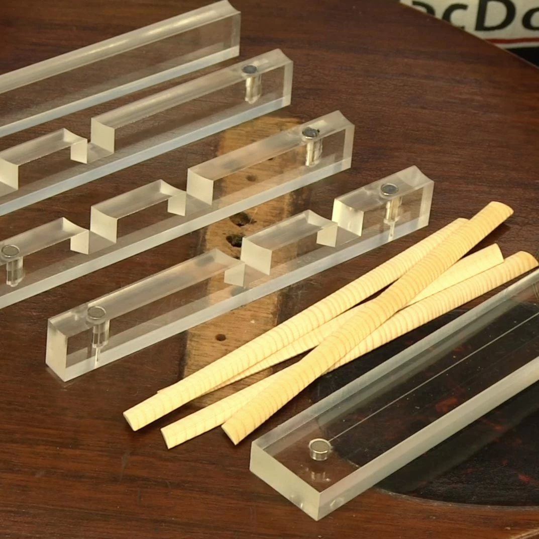 The interior cauls are notched to fit over the advanced X-braces on pre-war Martins. We include two blank cauls so you can cut notches to fit other configurations (additional cauls available). Magnets hold the interior/exterior cauls together through the guitar top.