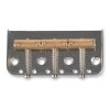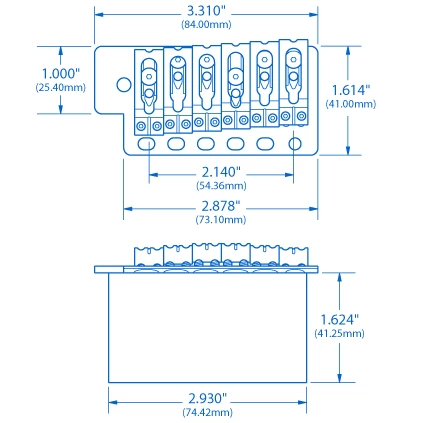 The baseplate holes are elongated so the screws won’t bind, for smooth, accurate pitch return. For tuning stability, the string mounting holes are staggered in the steel block for more consistent string angle over the adjustable locking bent-steel saddles.